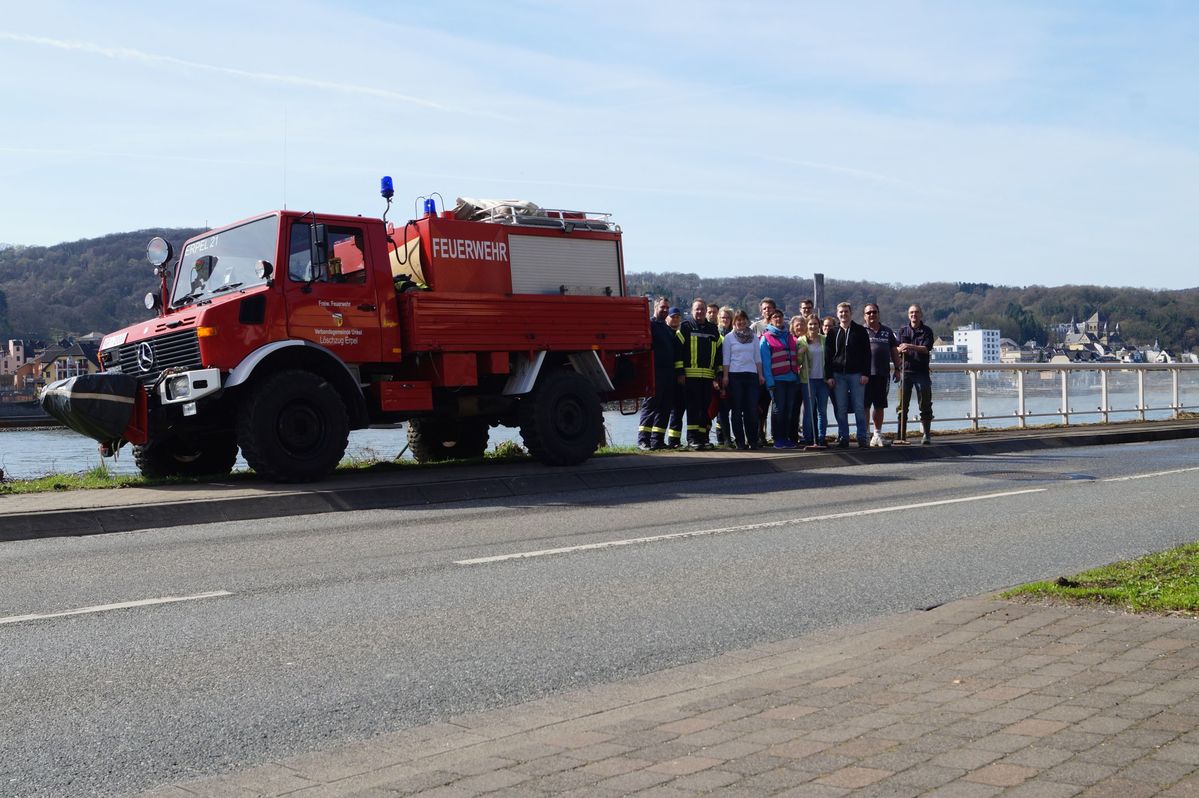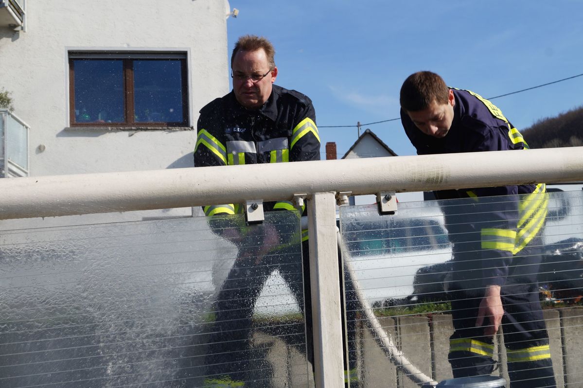 Dank großartiger Unterstützung der Freiwilligen Feuerwehr Erpel unter Führung des Wehrleiters Ernst Eich strahlt das Geländer jetzt wieder wie neu. Sogar für Absturzsicherung sorgte die Feuerwehr, sodass auch rheinseitig ordentlich geschrubbt werden konnte. Mehr Fotos, bitte weiterlesen.