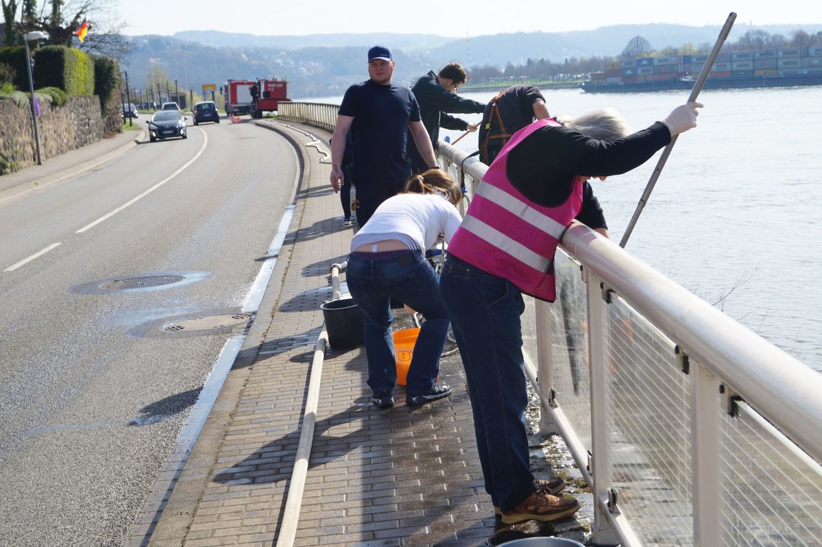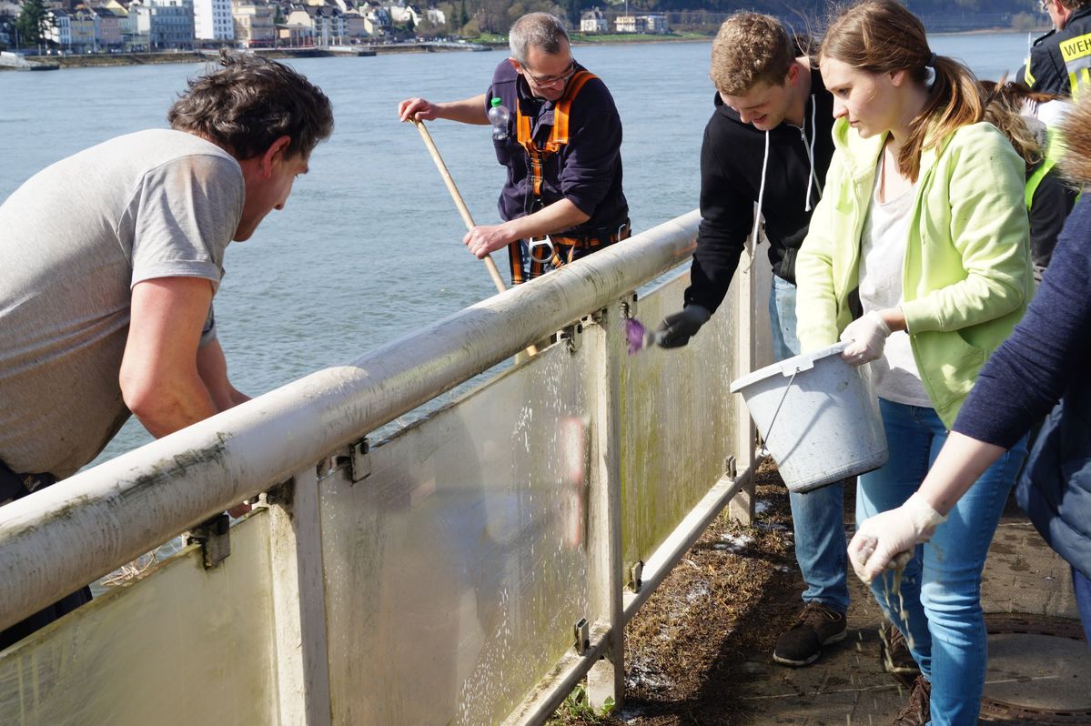 Am Samstag 25.März ging es voller Elan mit Schrubbern und Reinigungsmitteln gerüstet bei strahlendem Sonnenschein dem Geländer südlich der Rheinfähre an den Schmutz.