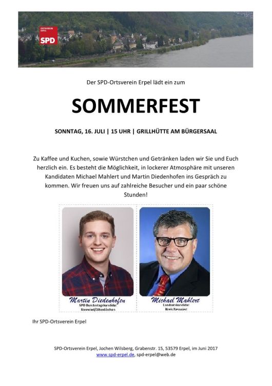 Am Sonntag den 16.07.2017 ab 15:00 feiert der SPD-Ortsverein Erpel sein Sommerfest an der Grillhütte am Bürgersaal Erpel.